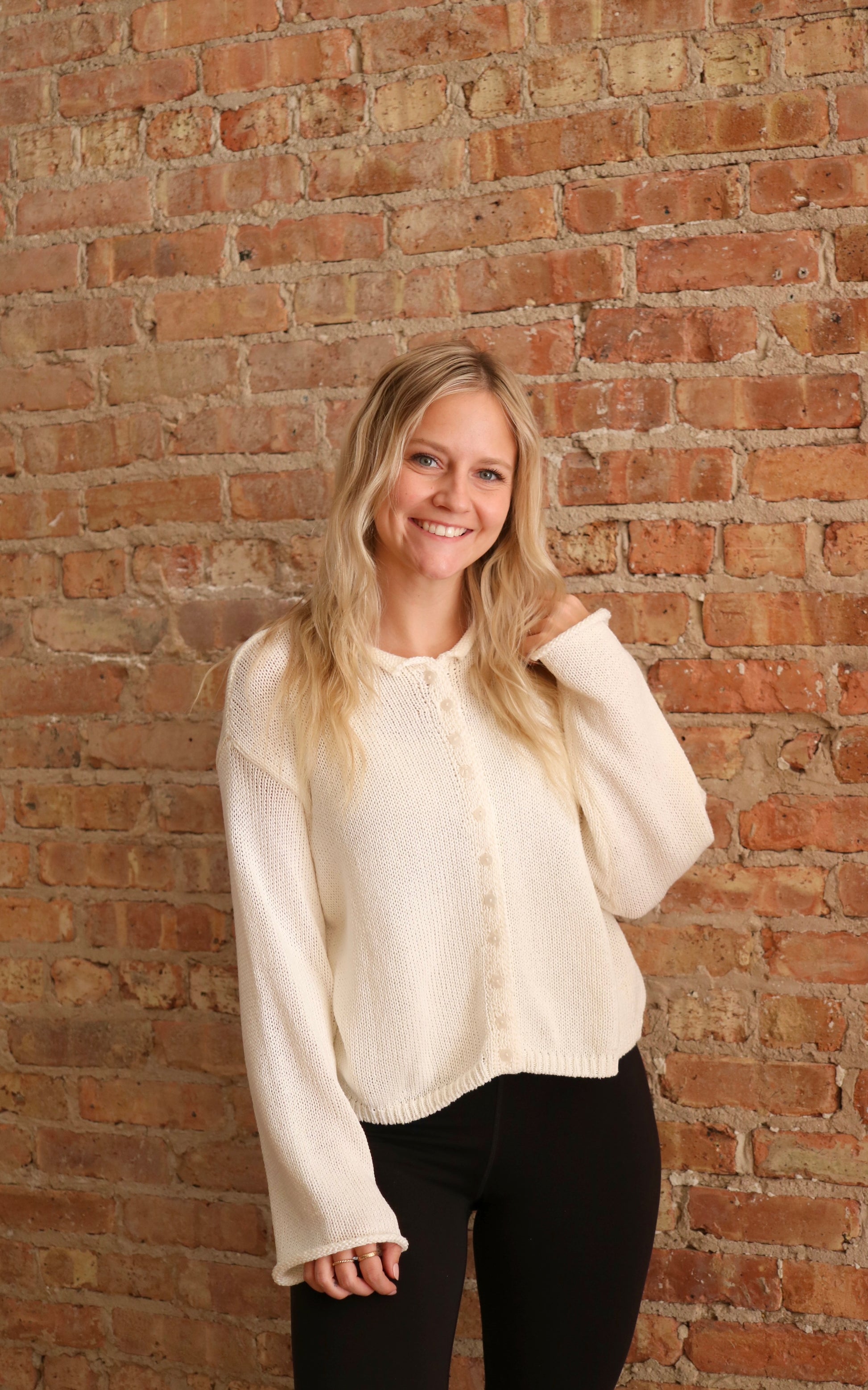 A cozy, soft, rolled neck knit cardigan to make the perfect basic, versatile piece. Pair with denim for the ultimate spring look!
