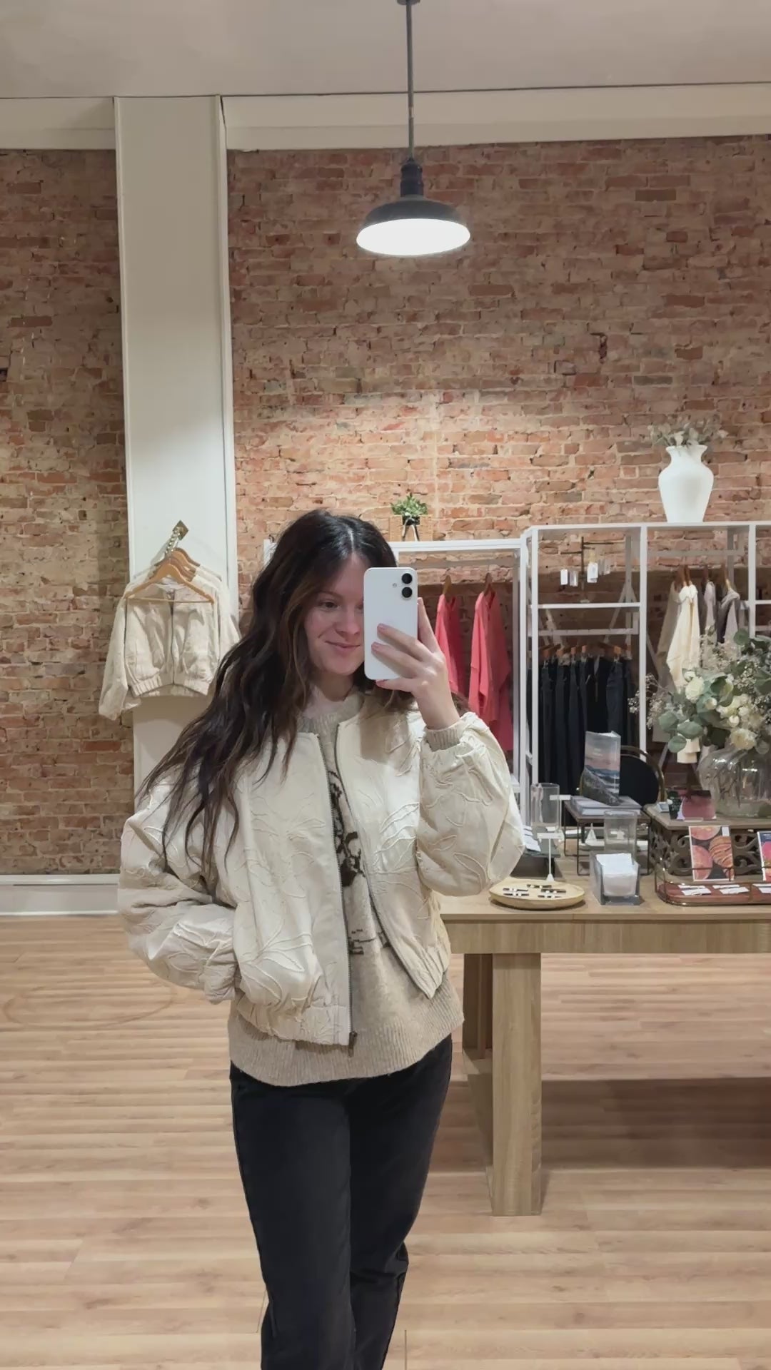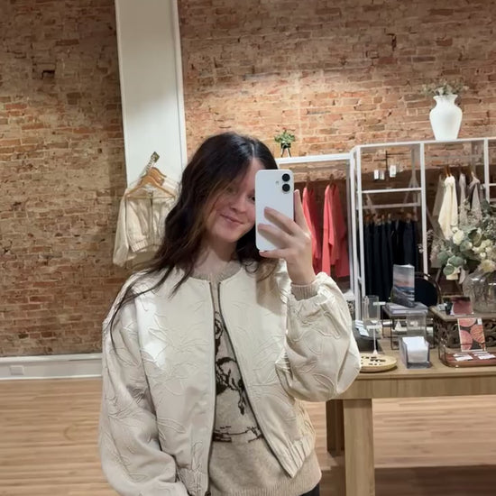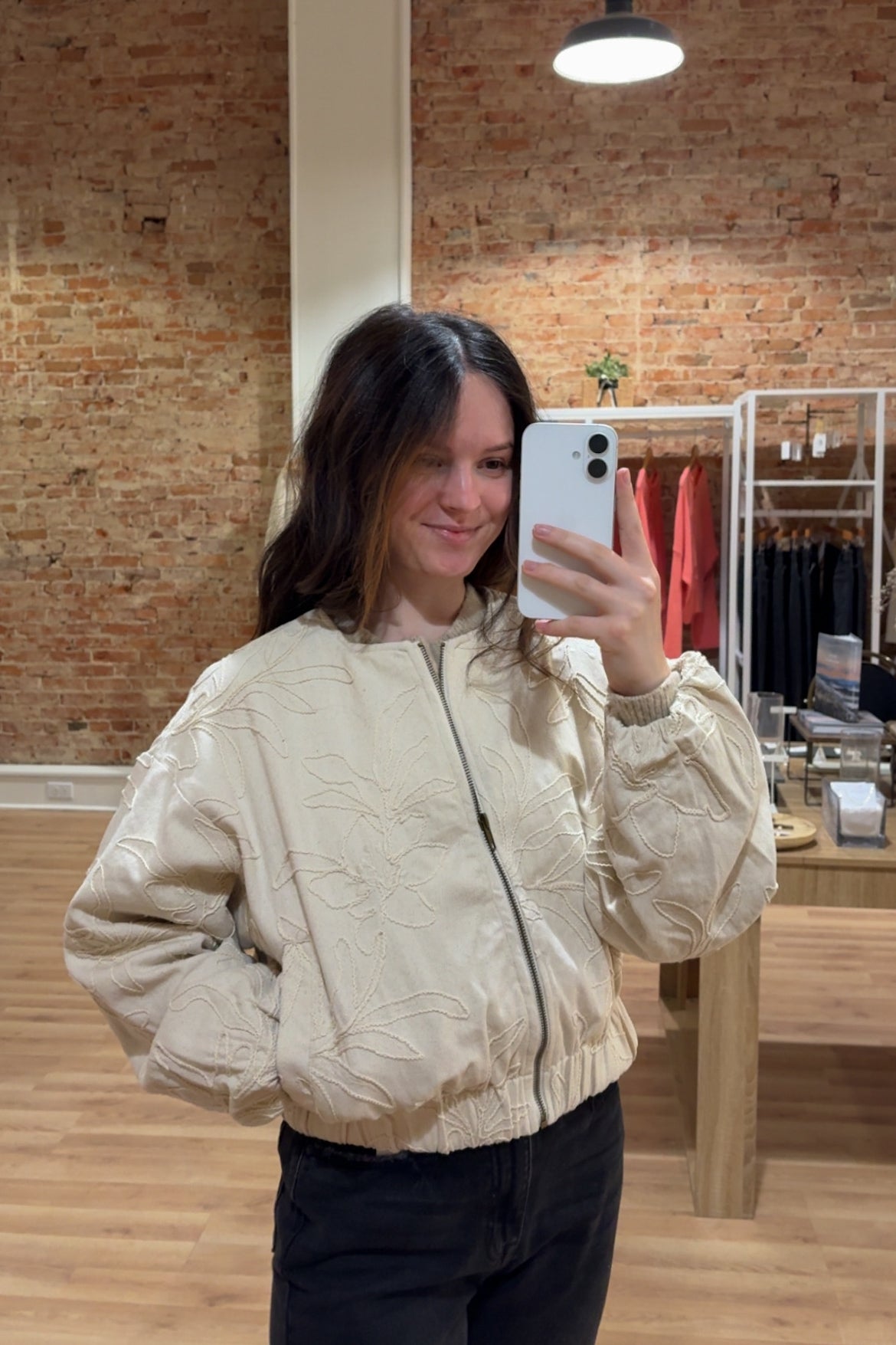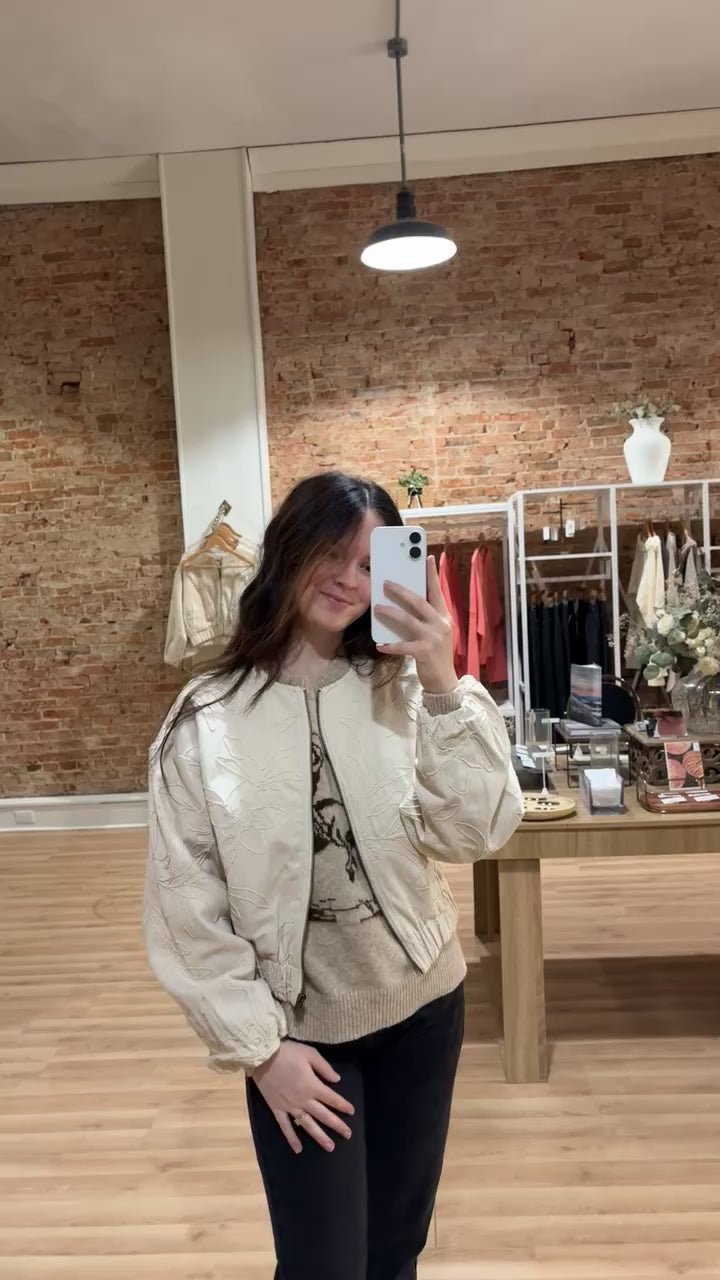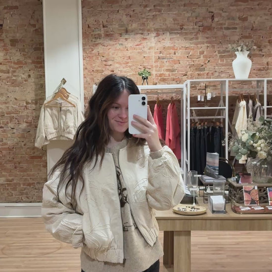 A perfect spring transition piece, this jacquard jacket pairs perfectly with a sweater and leggings or a plain tee and shorts! Features a full zip, two pockets, an elastic waistband and a cropped fit.