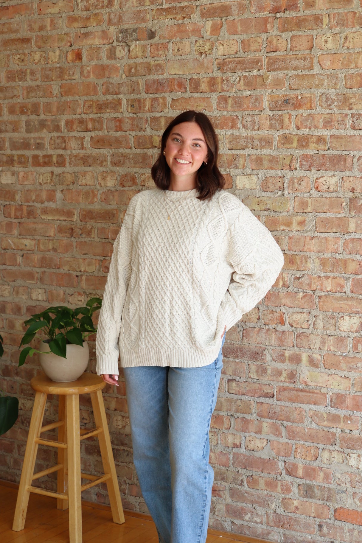 This cream colored knit sweater is a fall wardrobe DREAM. Slightly oversized, chunky knit, and perfect for every single fall occasion.