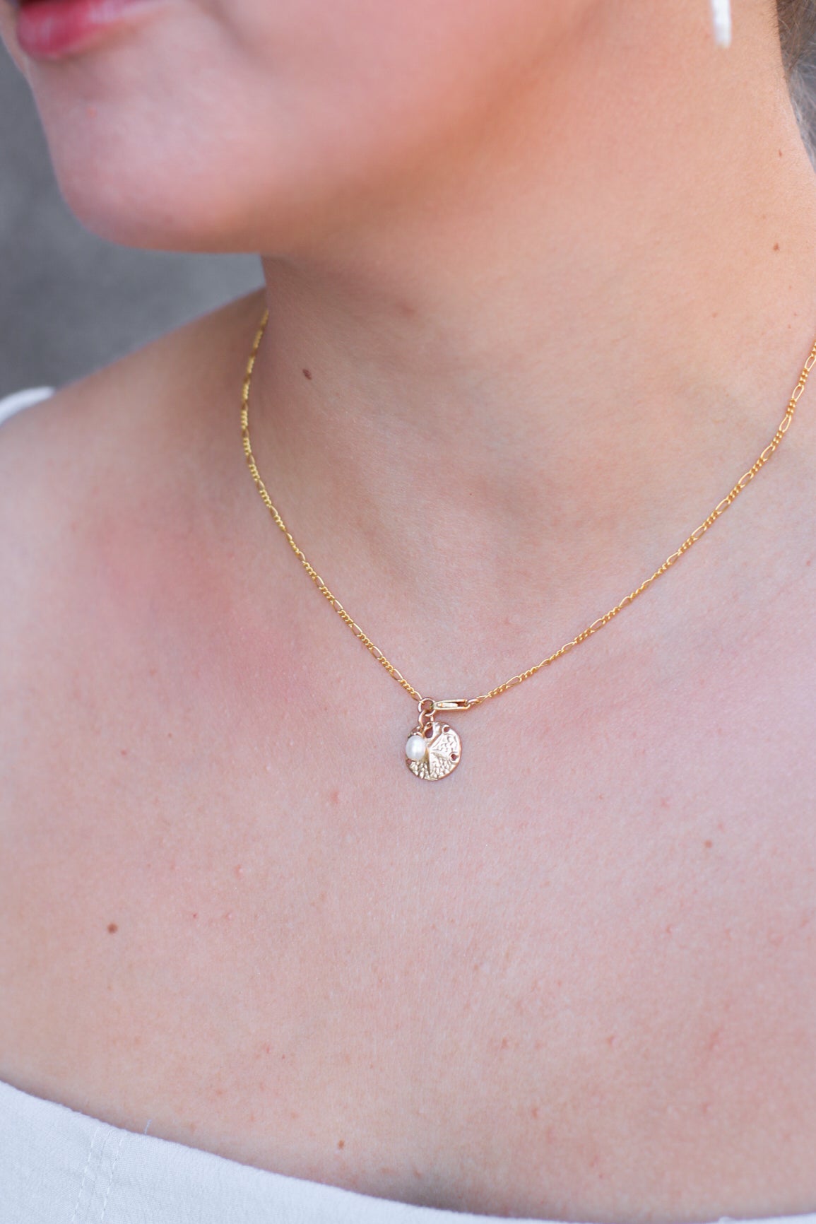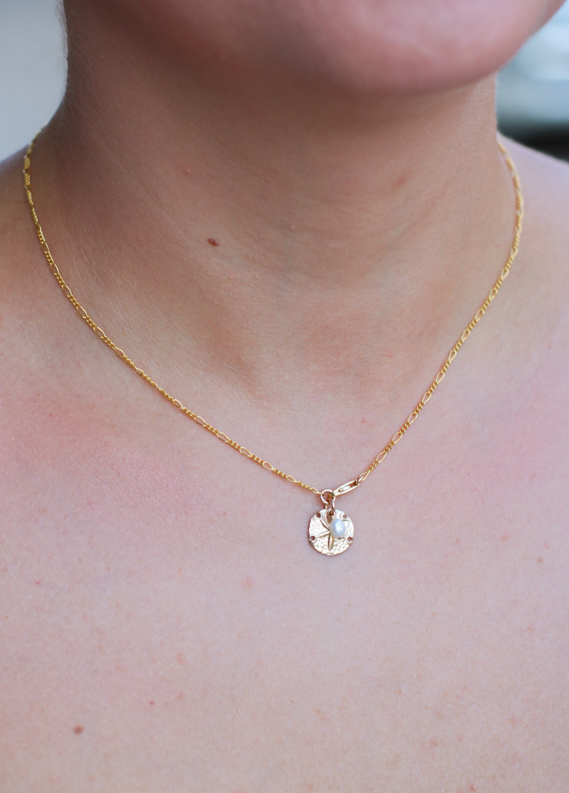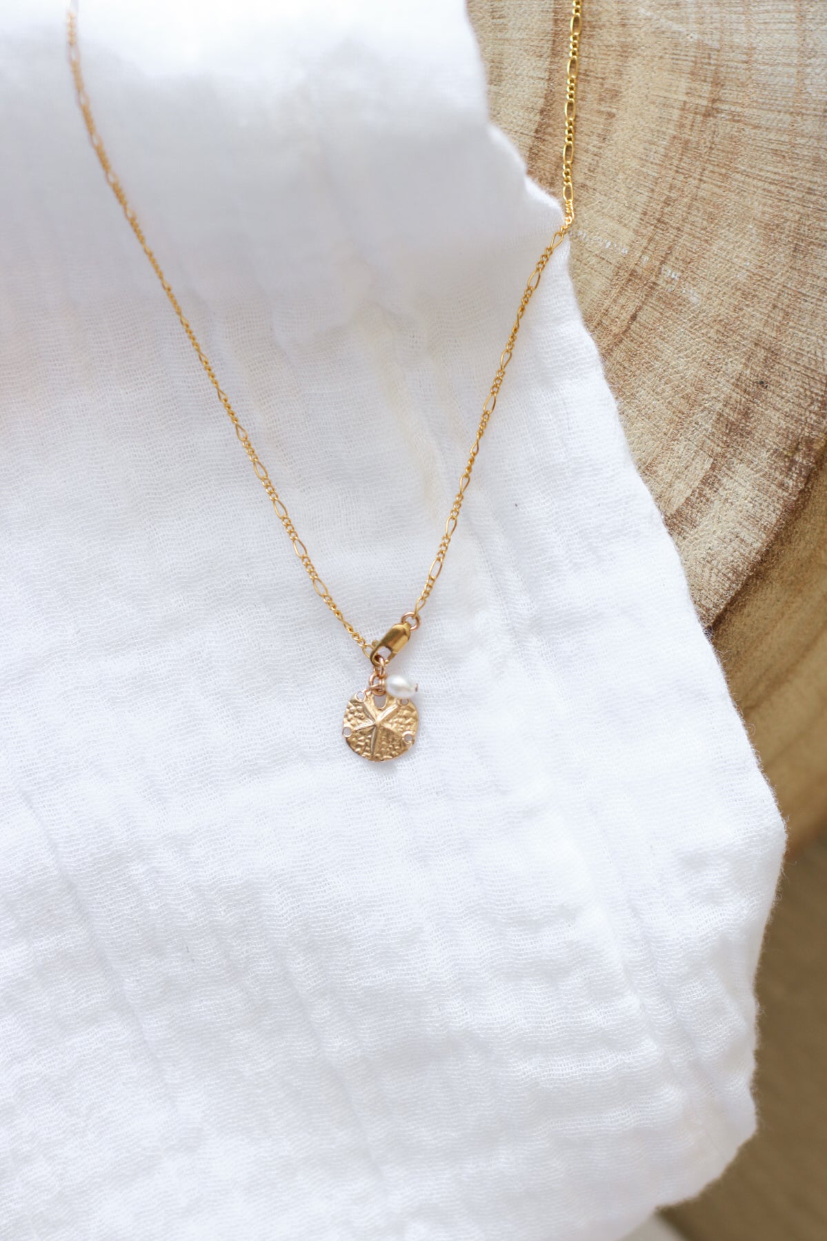 Add a touch of summer to your collection with our Sandy Shores Necklace!! Featuring a dainty figaro chain, gold-filled sand dollar charm, and a clasp at the front of the necklace. Please note, to maintain it's simple, chic look, there is no additional extension to this piece.