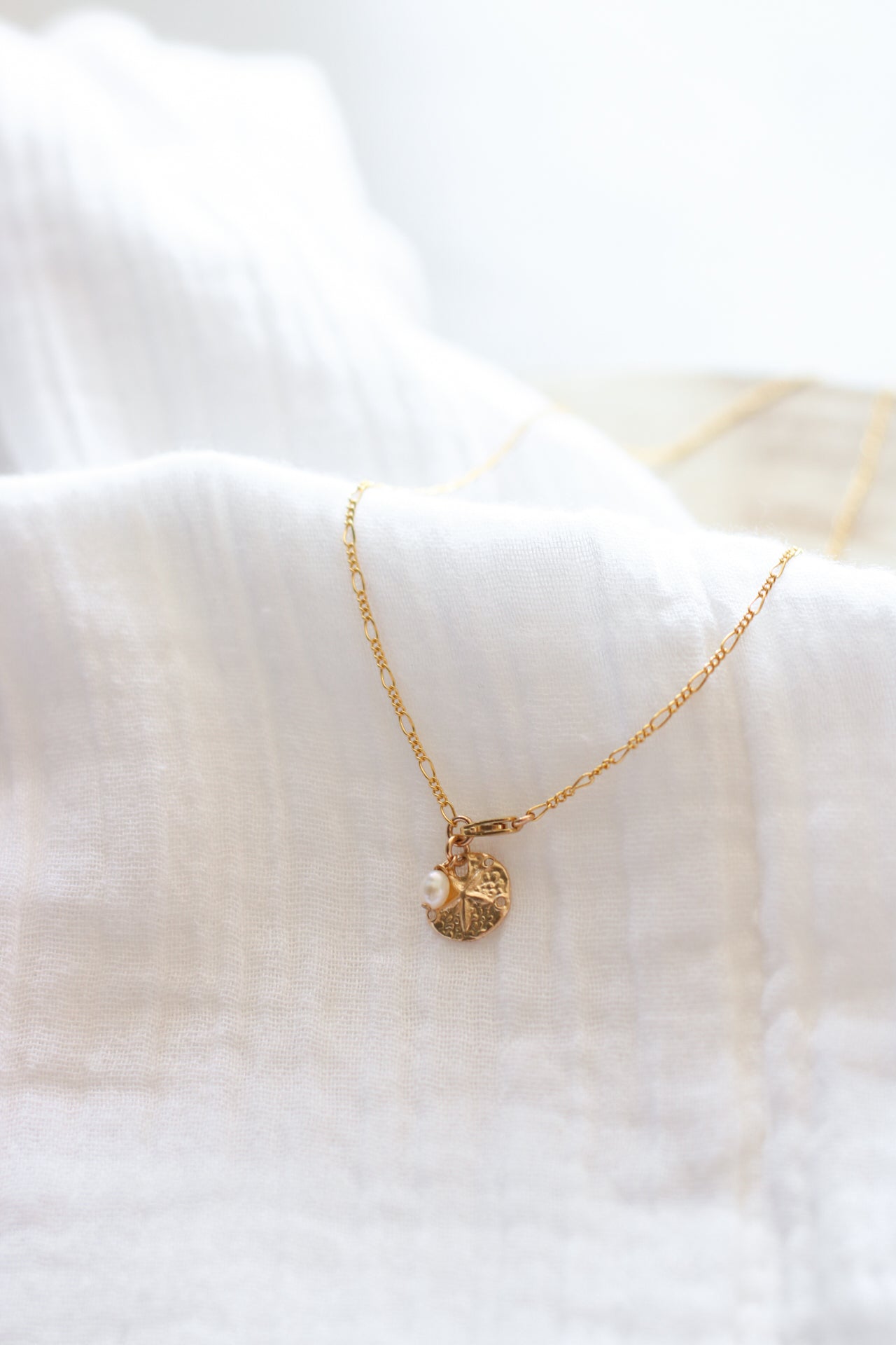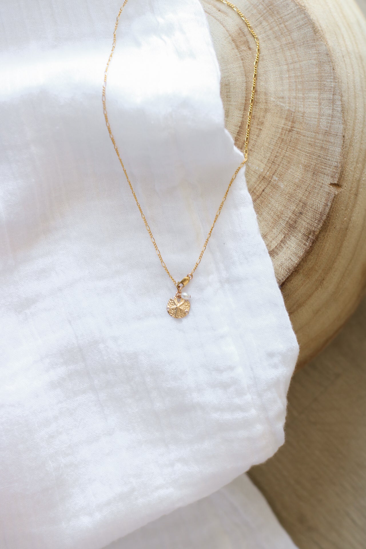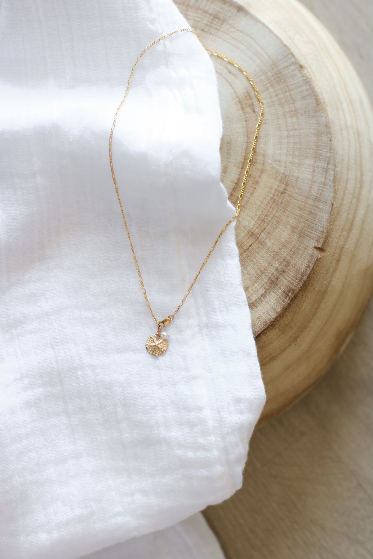 Add a touch of summer to your collection with our Sandy Shores Necklace!! Featuring a dainty figaro chain, gold-filled sand dollar charm, and a clasp at the front of the necklace. Please note, to maintain it's simple, chic look, there is no additional extension to this piece.